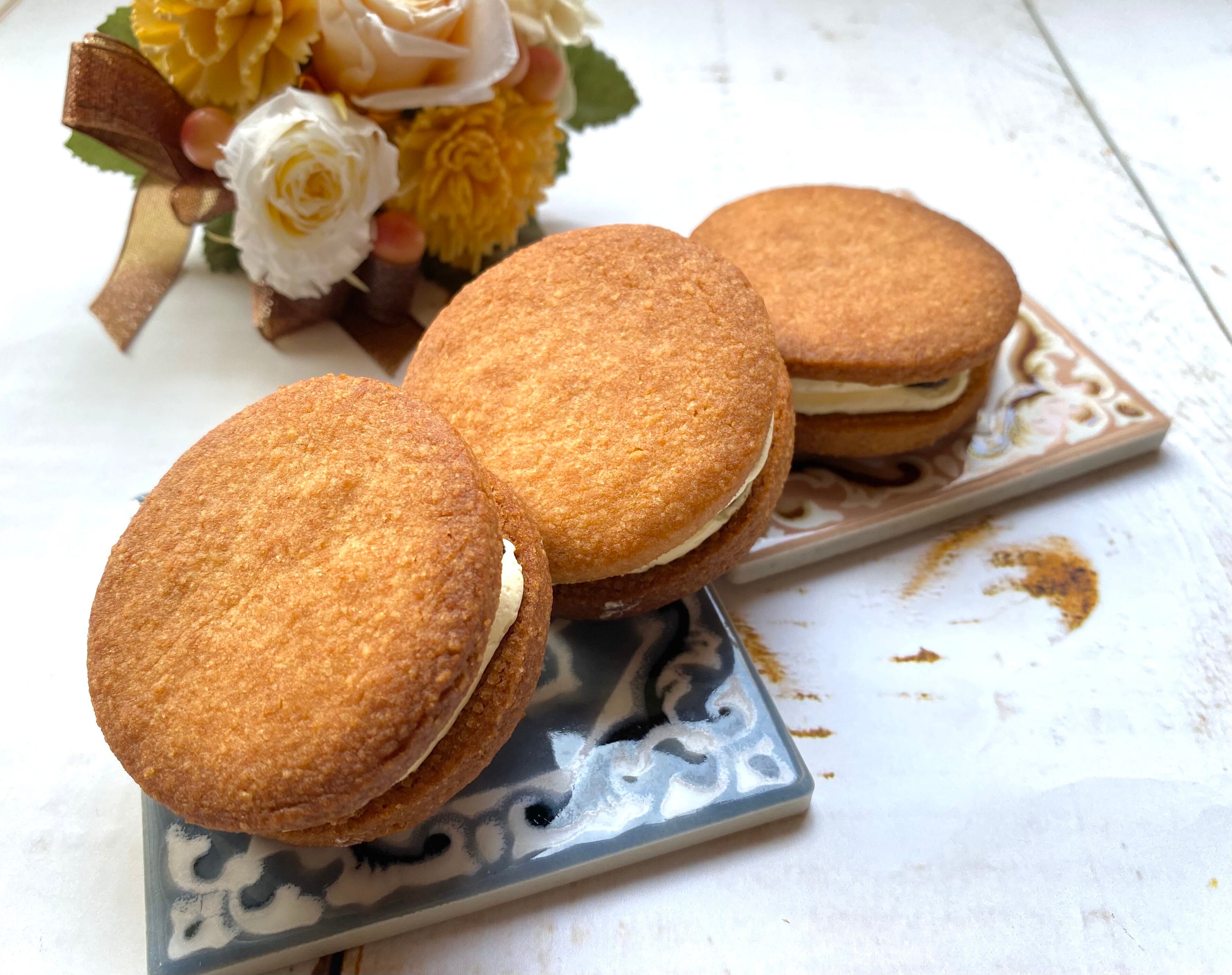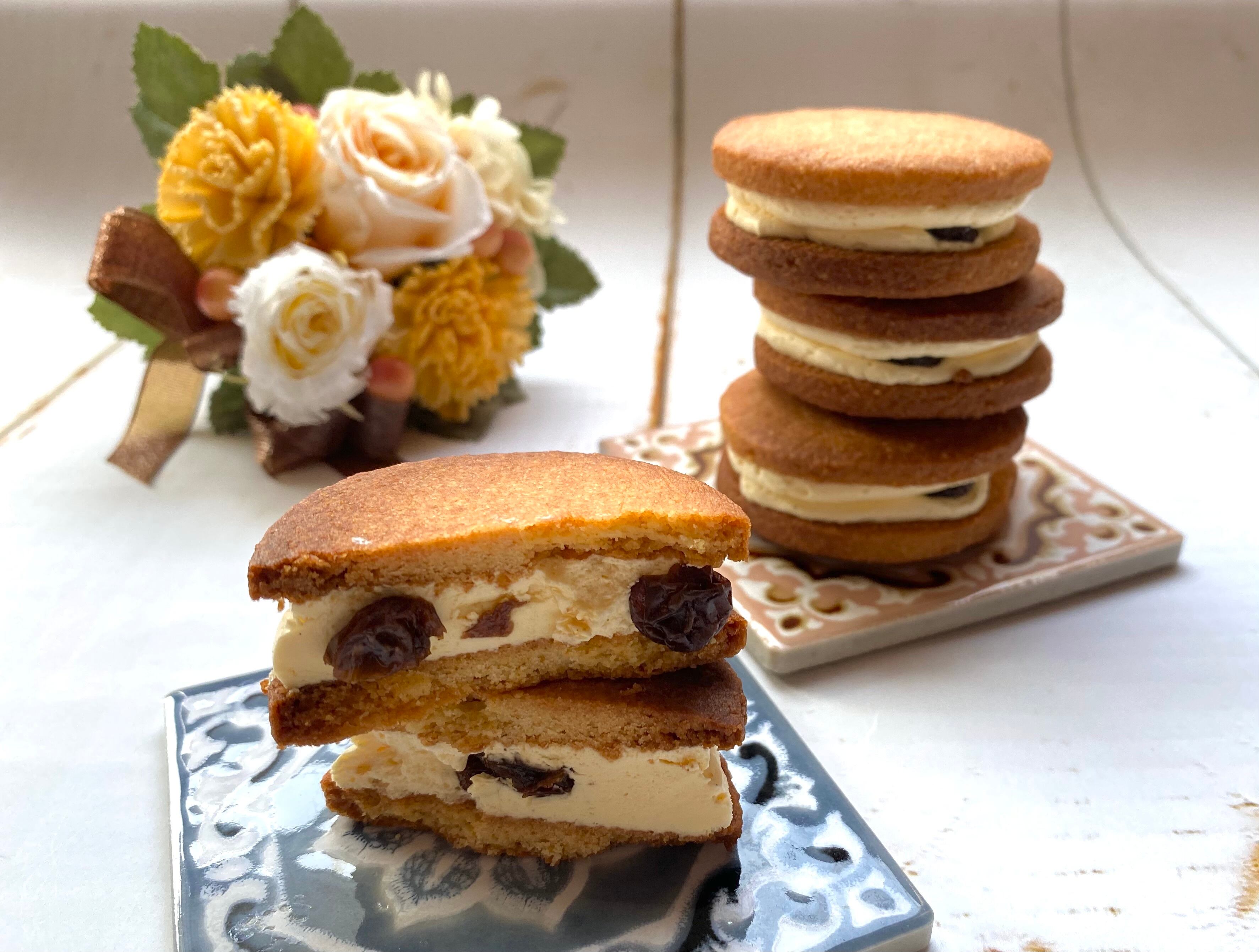 軽い食感のクッキーで、バニラ風味のバタークリーム、ラム酒が効いたレーズンをサンドしました。
